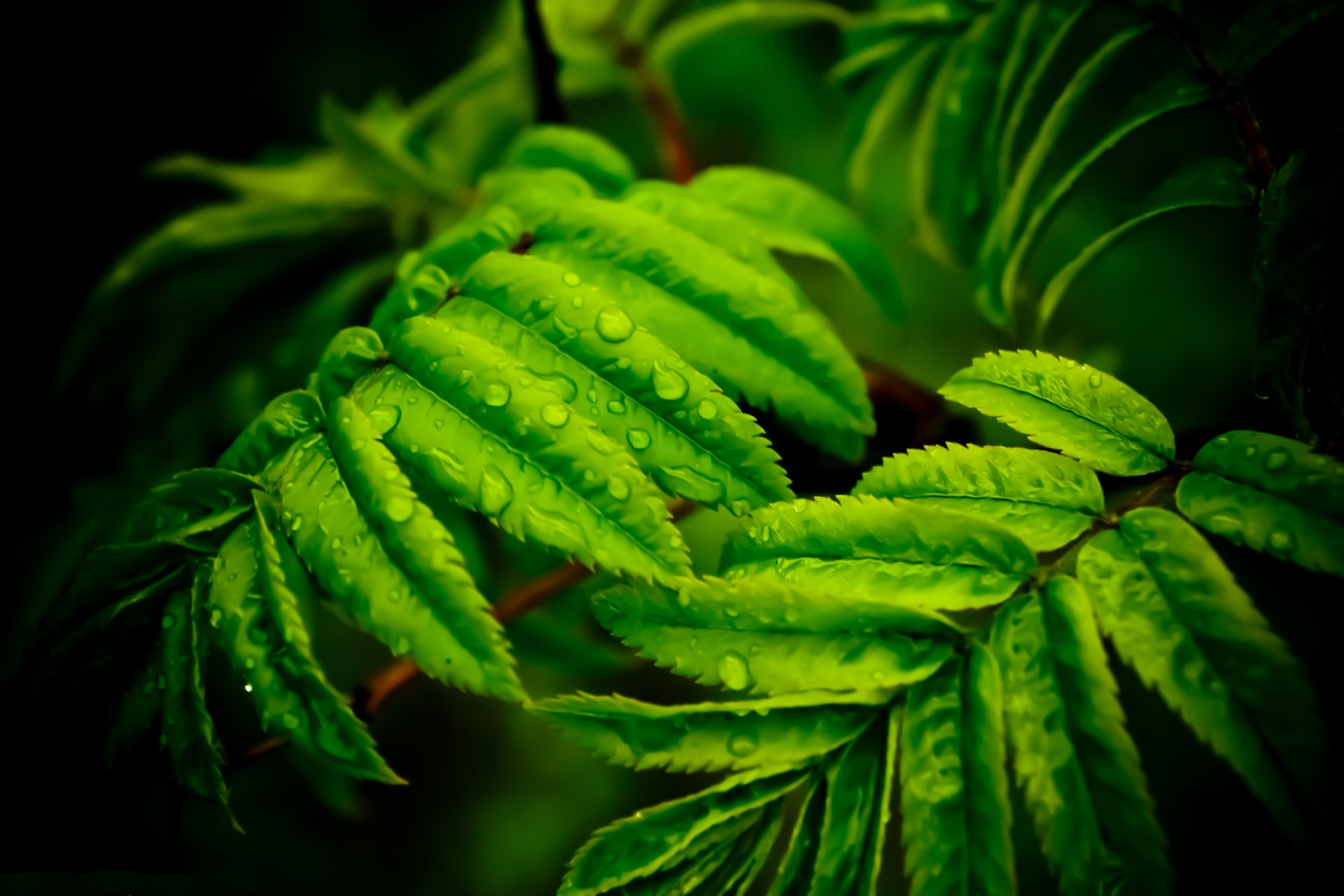 Ярко зеленые листья с каплями росы - обои на рабочий стол
