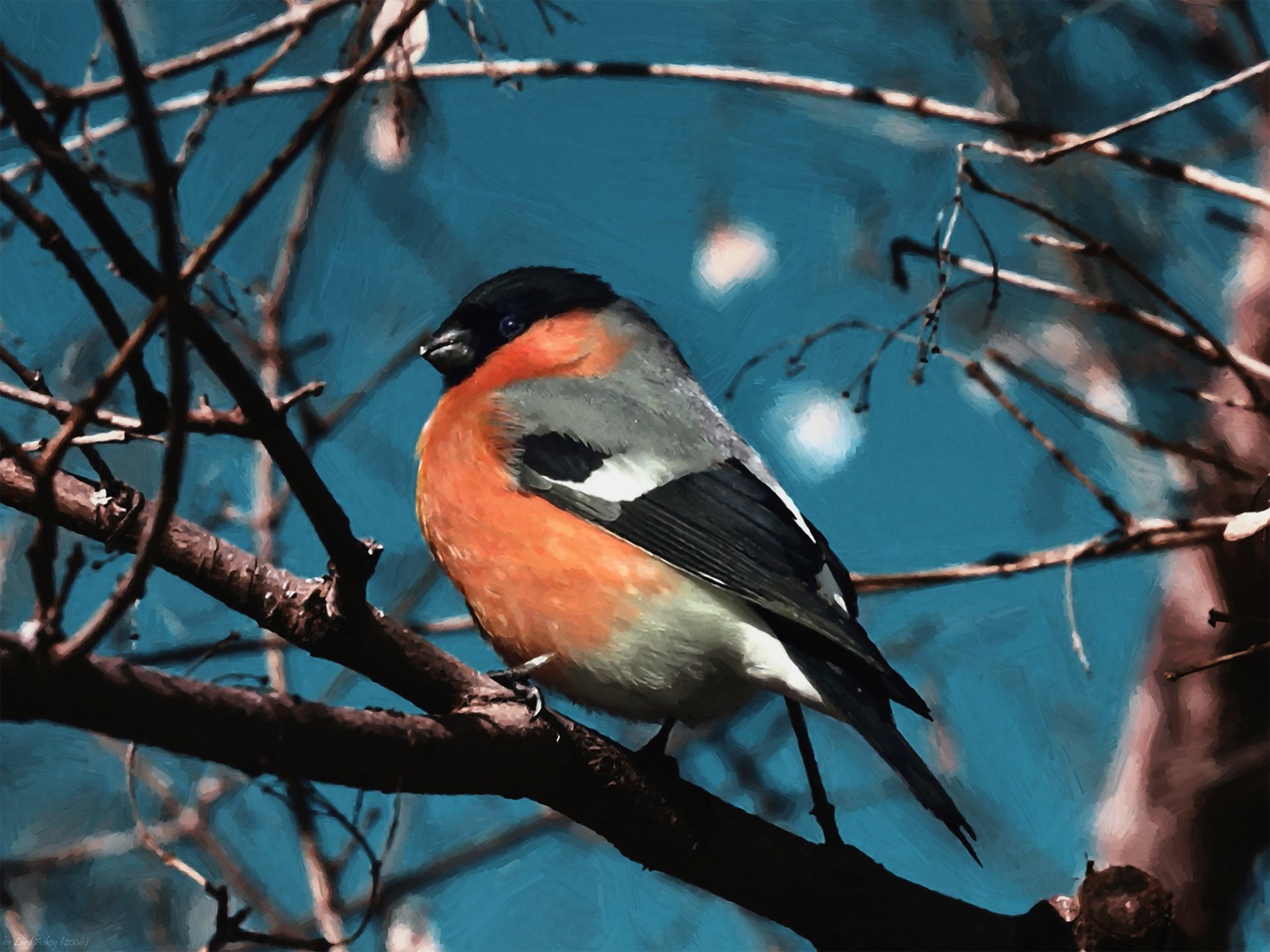 Теги:арт, снегирь, птица, дерево, ветви, солнечно